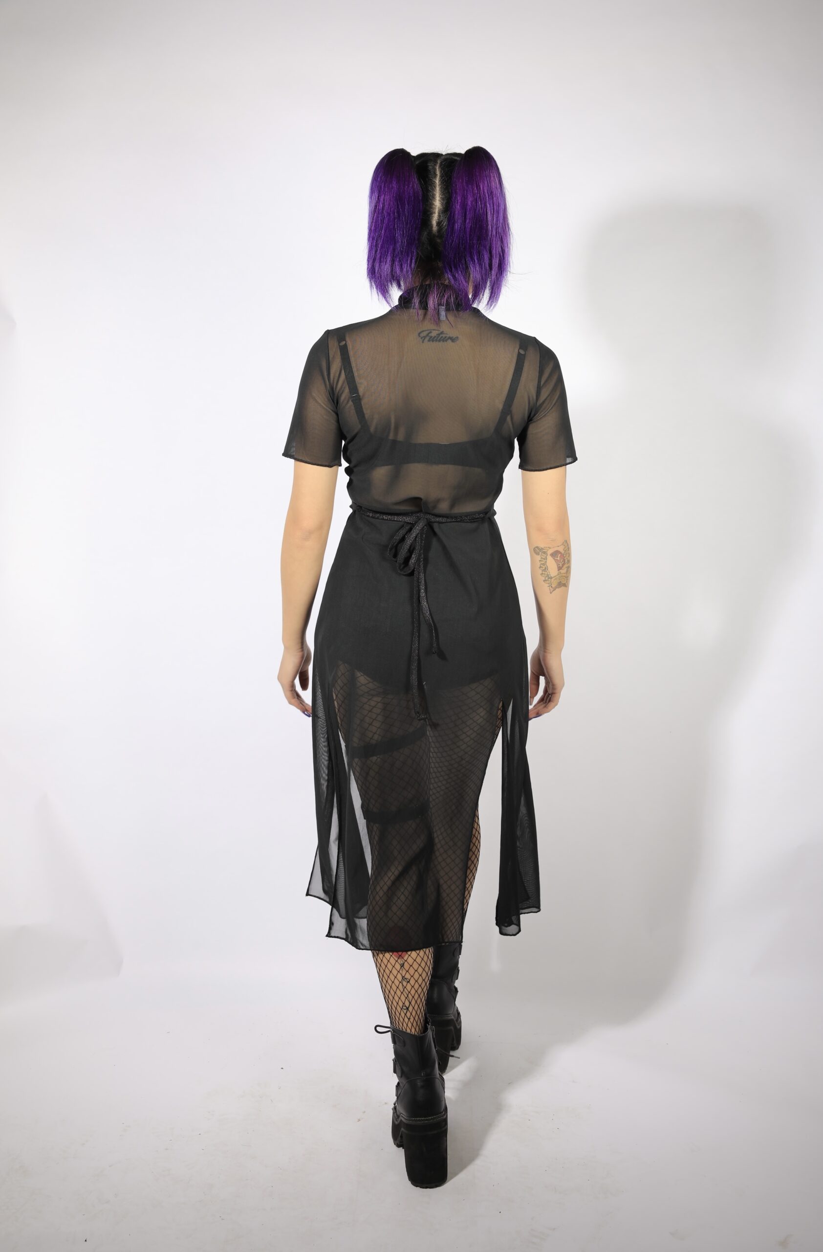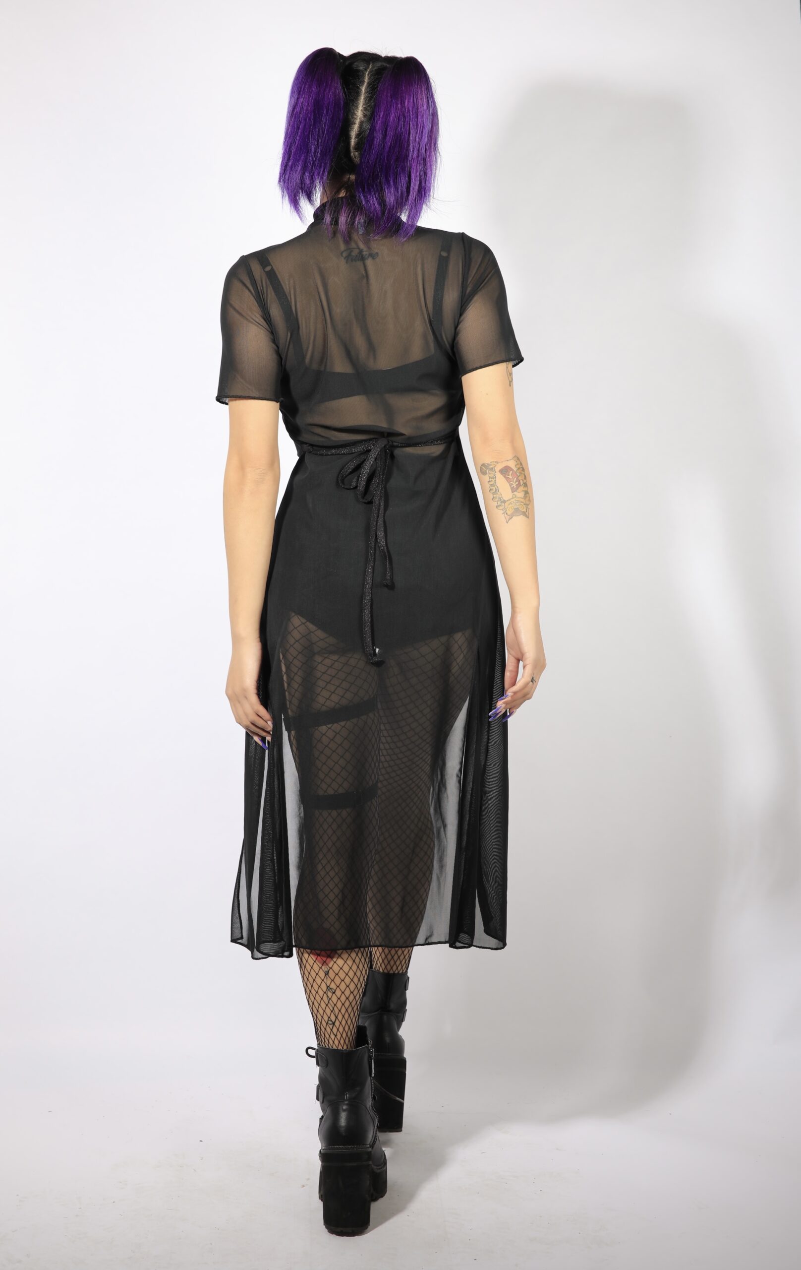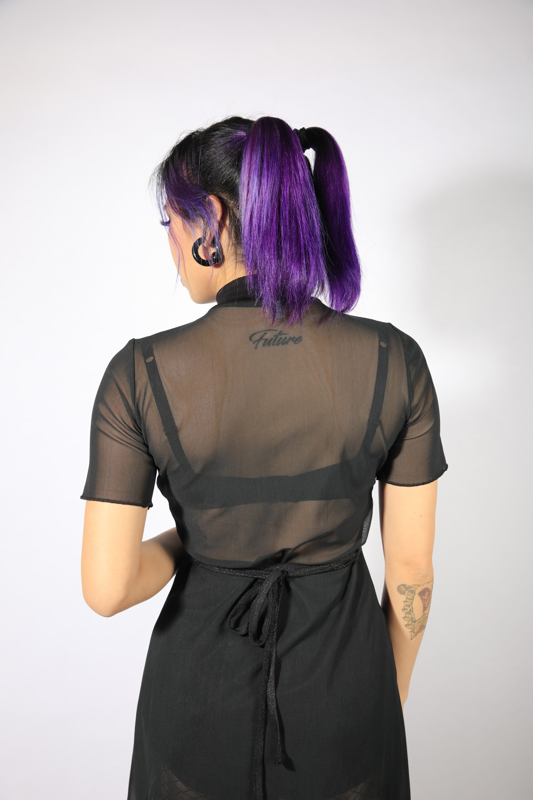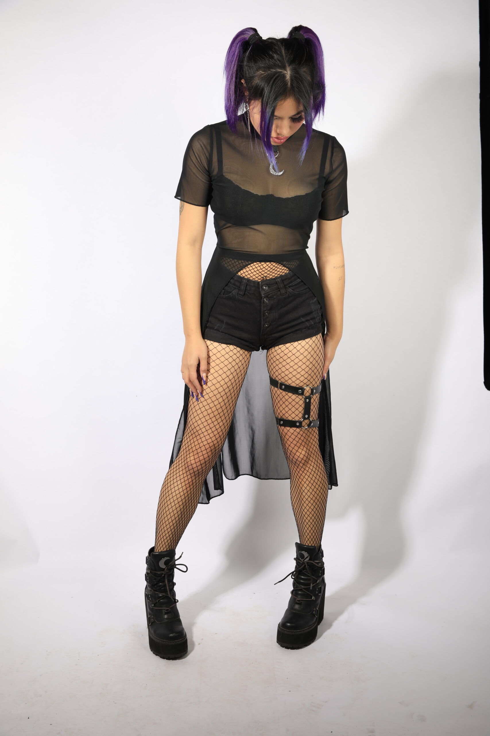 + Free ShippingBlack mesh asymmetric top with back lacing.